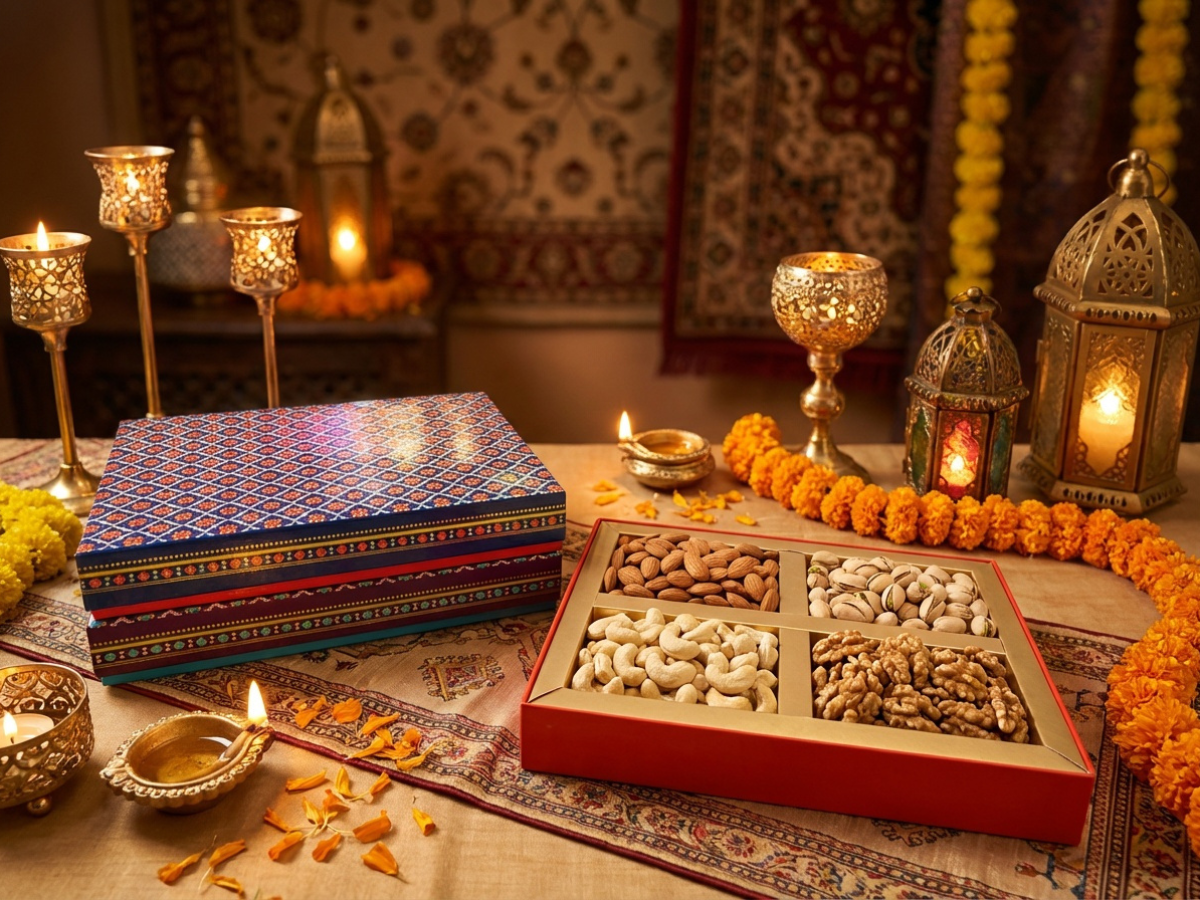 Dry fruit packaging • Covered dry fruit boxes • 4-part dry fruit boxes • Festive gifting • Wedding gifting • Corporate hampers • Premium retail packaging • Pan-India dry fruit box supply