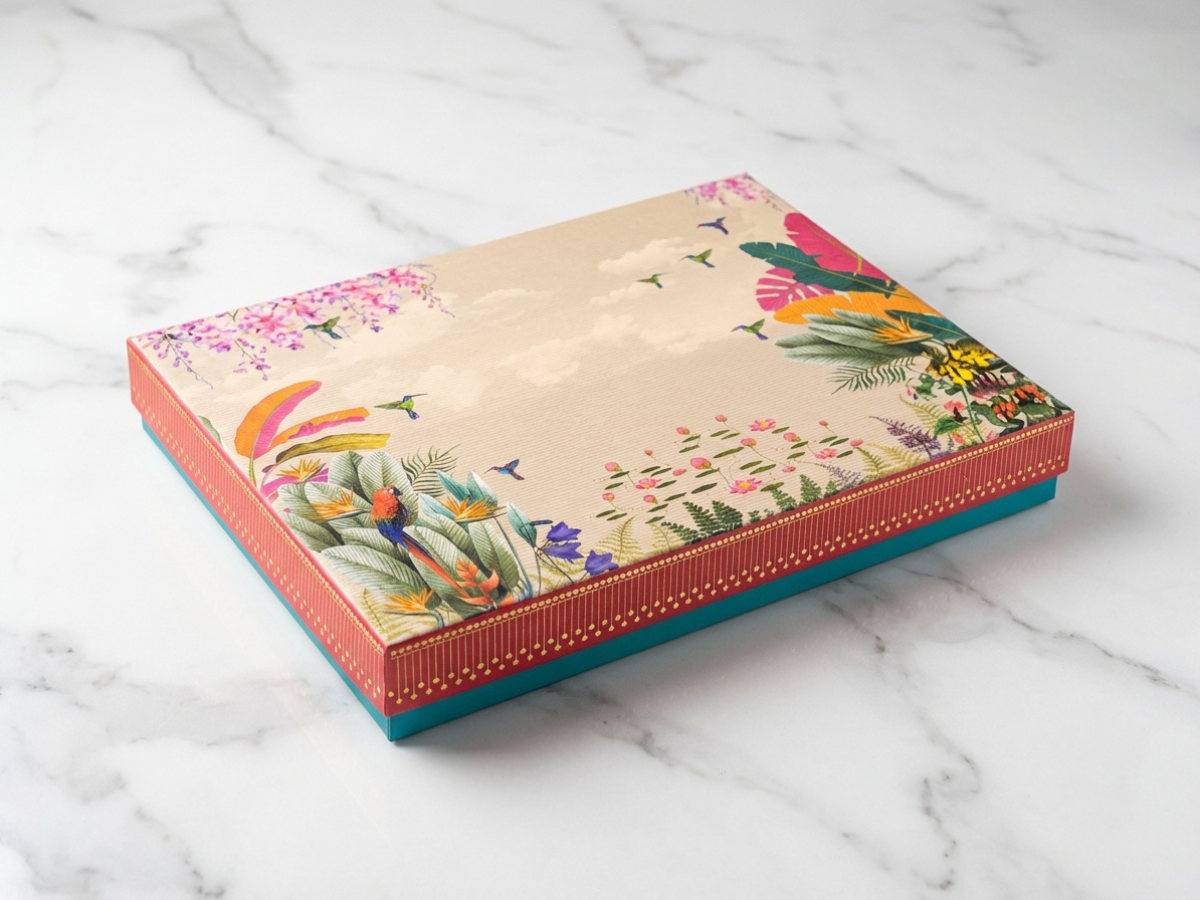 - Designed with a royal covered lid, adorned with elegant floral and nature-inspired artwork, delivering a rich, festive, and timeless luxury appeal.